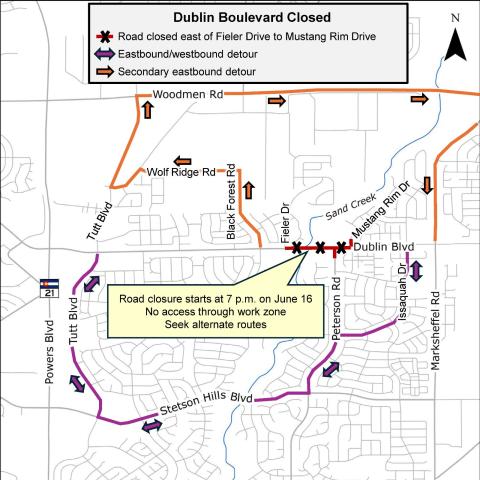 Several detour routes will be signed, and alternate routes are advised. The primary detour route is Tutt Boulevard to Stetson Hills Boulevard to Peterson Road to Issaquah Drive south of Dublin Boulevard. A secondary eastbound Dublin Boulevard detour will direct traffic left on Black Forest Road, left on Wolf Ridge Road, left on Templeton Gap Road, right on Tutt Boulevard, right on Woodmen Road and right on Marksheffel Road.