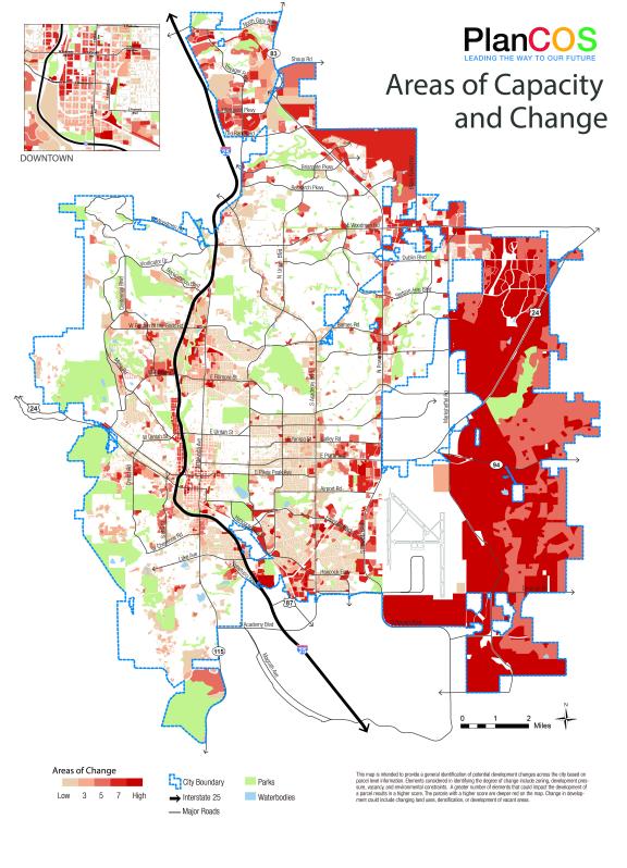 Our city has the land capacity to absorb our expected population and employment growth through 2040, primarily within existing city limits, but also with some targeted annexed areas. While the majority of this capacity is located in Banning Lewis Ranch, other newly developing areas of the city have their own opportunities. Together, the combination of vacant and redevelopable parcels in the generally developed areas of the city represents an opportunity for our community’s development needs.