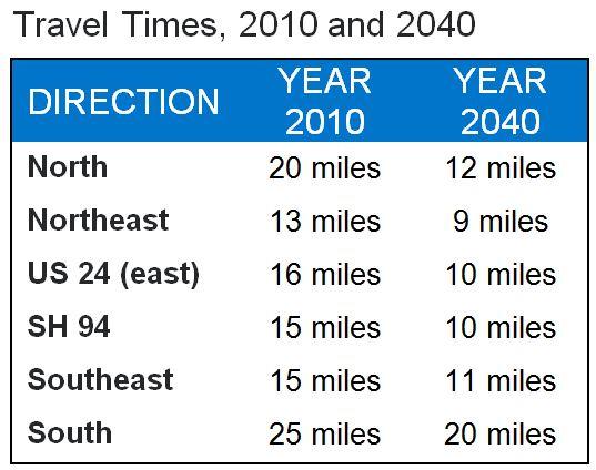 Transportation needs are not expected to keep pace with projected growth in population and employment through the year 2040. Increasing population growth plus the lack of good east-west corridors is expected to cause the travel length of a 30-minute trip to decrease. This highlights the importance of continuing the PPRTA program after the current program expires in the year 2024 in order to keep Colorado Springs as a city with relatively less congestion than its peer cities.