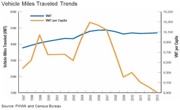 Vehicle-miles traveled (VMT) per capita in the state of Colorado had been decreasing since 2006, although there has been an increase in overall VMT in recent years, likely due to a combination if a strong economy and sustained low gas prices. However, aspects of this longer term shift appear to be connected to other factors. Evidence suggests that the decline is likely due to the lower auto ownership rates by the Millennial generation, changing demographics and congested highways. This trend suggests two possible outcomes. First, a preference for compact, mixed-use neighborhoods which reduce the need for driving and the potential favoring of other travel modes such as walking and biking and riding transit. Second, declining transportation revenue per capita as less driving would lead to lower per capita fuel usage which would result reduced gas tax revenues to fund transportation infrastructure.
