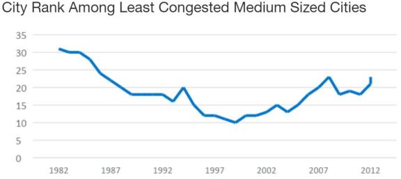 Since TTI has been recording this data, Colorado Springs’ position on this list declined for almost two decades, but has improved dramatically since the turn of the century. In the early 1980s, the City was one of the least congested medium sized cities. Due to rapid population growth and relatively lack of investment in infrastructure the City through the 1980s and 1990s became one of the more congested medium sized cities. Widening of the I-25 corridor through the City and the City’s PPRTA program of capital improvements has effectively reduced the City’s congestion relative to other similar cities.
