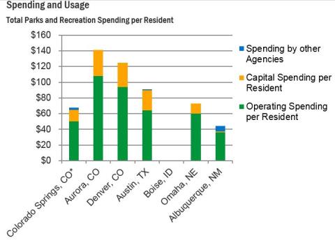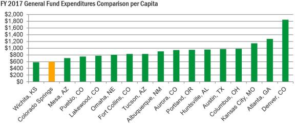 Cities provide a range of services at varying levels of service. The City of Colorado Springs spends less per capita for City services than comparable cities in Colorado and elsewhere, which is likely due to the Colorado Springs’ revenue limitations. It should be noted that the expenditures shown reflect General Fund expenditures only. For some jurisdictions General Funds can be a reflection of the amount spent on general services. However, some general services can be funded through non-General Fund sources of revenue (such as the City of Colorado Public Safety Sales Tax).