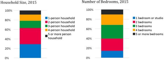 The choices that Colorado Springs residents make represent the continuation of national trends that impact what households look like today including wealth, mobility, delay of marriage, increased longevity, and a departure from traditional family structures. There are over 50,000 single-person households in Colorado Springs, which translates to 29% of all households citywide. Given this increase in smaller households, there is an inadequate supply of smaller housing units; close to 60% of units have 3 or more bedrooms, whereas only 37% of households have 3 or more people. Although 29% of the population lives alone, only 14% of the units are 1 bedroom or studio units.