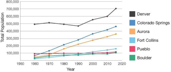 Colorado Springs has seen extraordinary population growth over the last 50 years, establishing itself as a strong urban hub for southern Colorado. Since the 1960s its annual population growth has been greater than the majority of cities in Colorado. Although the City’s long-term rate of population growth has slowed somewhat compared with the period from the 1950s through the 1980s, the City continues to grow at rates considerably above the national average. It is expected to match Denver’s population in the future.