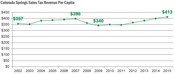Like most municipalities in Colorado, Colorado Springs is dependent on sales tax revenues to fund core services and infrastructure. Current per capita retail spending in the City is just above the statewide average. However, shifts in consumer behavior (with a trend toward online purchasing which is often tax-free) and demographics in the City may have a direct effect on our future fiscal sustainability. Anticipating these trends and seeking to mitigate negative fiscal impacts through physical planning and policies can create quality places and opportunities to maximize revenue.