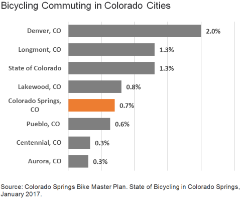 The League of American Bicyclists (LAB) designated Colorado Springs as a Silver Bicycle Friendly Community in 2012 and they noted the strong commitment to bicycling in the community as evident by the large number of bicycling-related organizations and businesses including the United States Olympic Committee, and a supportive city government. However, despite this commitment, Colorado Springs compared to other Colorado cities sees only a small percentage of people bicycling on a regular basis. As shown in the graph, Colorado Springs bicycling mode-share is comparable to Lakewood and Pueblo but overall it is lower than the statewide average. Although not shown the figure, the highest rates of bicycling in Colorado occur in Boulder, CO (11.1 percent) and Fort Collins, CO (7.4 percent). These cities are among the leaders in bicycle commuting nationwide and, as college towns, have very different demographics and land use patterns than Colorado Springs. While there are robust bicycle programs and organizations in the City, they are mostly focused on children and those who already bike instead of the broader population. Furthermore, a 2016 on-line survey targeting Colorado Springs residents indicate that interactions with drivers, high traffic volume and speed, and lack of safe routes are among the strongest deterrents to bicycling. Additional analysis this survey data reveal that respondents would be more comfortable to bike in facilities that were curb-protected or barrier protected.