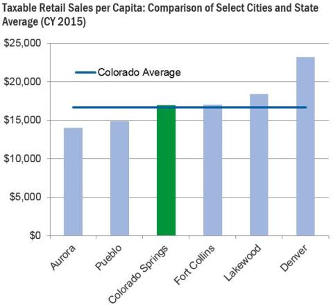 Compared to other Colorado cities and the state, taxable retail sales per capita in Colorado Springs is close to the statewide average and in the mid-range of comparable cities.