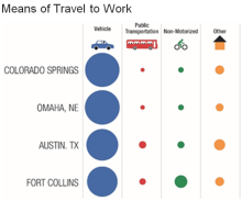 Compared to other mid-size, mid-continent cities the mode split of public transportation and non-motorized uses tends to be lower than similar cities. Fort Collins, who has been more proactive in building bicycle facilities citywide, has a non-motorized share of nearly 10%.