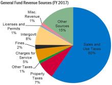 Like most cities in Colorado, sales and use tax revenues are the major source of revenue in the General Fund. In Colorado Springs, sales and use taxes comprised 60% of the City’s General Fund budget, as of 2017. Reliance on a relatively volatile revenue source such as sales tax requires the City to be diligent in preparing for inevitable economic downturns.