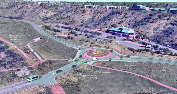 The primary goal is to increase safety through the corridor. This will be achieved by widening the roadway with asphalt multi-purpose shoulders and improving the intersections of Fontanero Road, Water Street, and Gateway Road. Gateway Road will be reconstructed with a single-lane roundabout that includes a pedestrian underpass, connecting to the Foothills Trail inside Garden of the Gods Park.