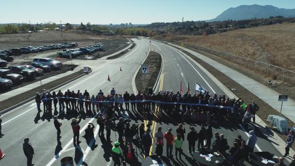 Several dignitaries, city, county and state staff, and neighbors participated in cutting the ribbon to officially open the new Centennial Boulevard Extension to traffic. Speakers at the event included Colorado Springs Mayor John Suthers, Colorado Springs City Councilmember Dave Donelson, Colorado Springs Utilities CEO Aram Benyamin and El Paso County Commissioners Stan VanderWerf and Holly Williams.